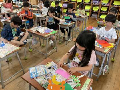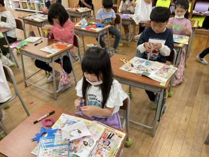 図画工作の学習では、ハサミを使って飾りづくりをしました。