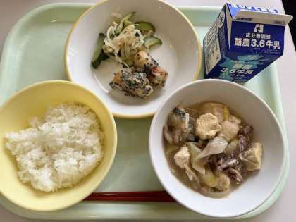 本日の献立は、ごはん、ちくわの南部揚げ、甘酢和え、すきやき、牛乳 です。