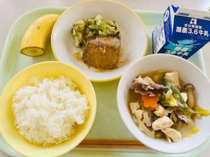 今日の献立は、ごはん、ふくらぎの西京焼き、昆布和え、肉豆腐、バナナ、牛乳 です。