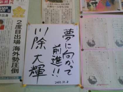子供記者★6月6日(火)「有名人」 公開日 2023/06/06 更新日 2023/06/06 子供記者のページ パラリンピック金メダルを取った、川除選手のサインです。 自慢の先輩です。 子供記者 6年1組 S・E