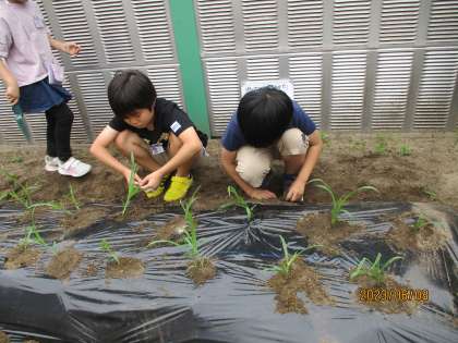 チャレンジキッズの時間に種から育てていたポップコーンの苗を丁寧に植えました。サツマイモの苗植えの経験を生かし、畝作りにマルチ掛けと手慣れた手つきの子供たちです。