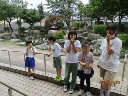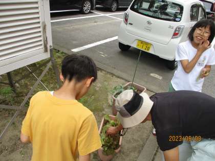 その後、プランターで育てているサニーレタスを収穫し、その場でみんなで食べました。「にがい!」と言いつつも、自分たちで育てた野菜を美味しそうに食べていました。用務員さんにも「新鮮で美味しい!」と言っていただきにこにこの子供たちでした。