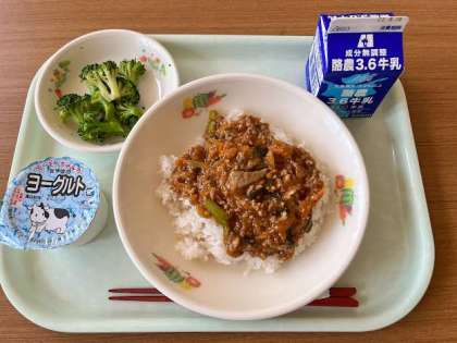 本日の献立は、もりもり麻婆丼(麦ごはん)、ゆでブロッコリー、かき玉汁、ヨーグルト、牛乳 です。