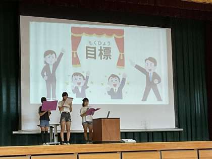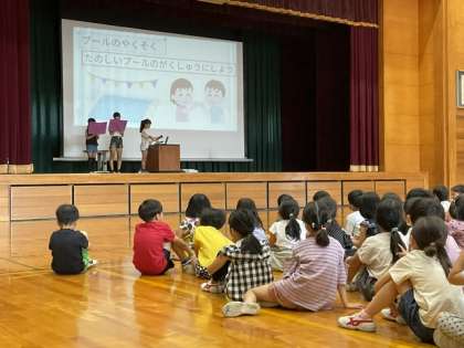 今朝、プール開きがあり、6年生児童や先生から、1)命を守ること、2)清潔にすること、3)目標をもって学習に取り組むことについての話がありました。