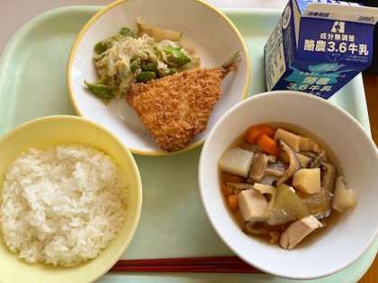 本日の献立は、ごはん、あじフライ、グリーンアスパラのごま和え、高野豆腐と冬瓜の煮物、牛乳 です。