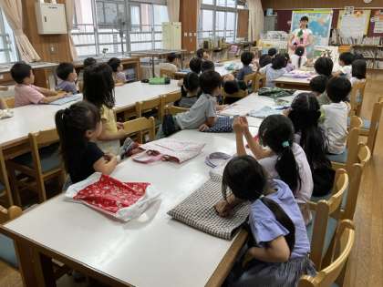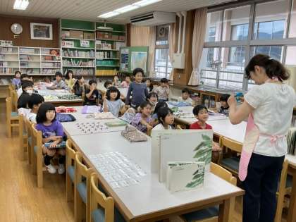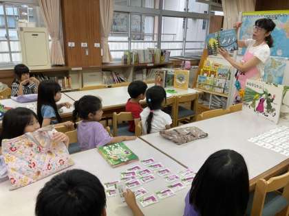 今日は司書の先生に、国語の教科書にも載っている「おおきな かぶ」のエプロンシアターとおすすめの本紹介をしていただきました。