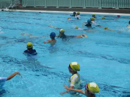 今日の水泳学習の様子です。今週2回目、1学期で5回目の水泳学習です。泳げるレベルごとに3つのグループに分かれて練習していますが、中級レベルの子どもたちが増えてきました。けのびの形がきれいにできる子も増えています。