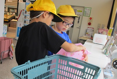 「みんなではたらき隊」の学習でがんばって稼いだお金で、買い物に行きました。グループになり、相談しながら予算に合わせて計算しながら買い物をすることができました。