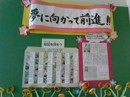 これは図書室の前にある「夢に向かって前進!!」と、かいてあります。