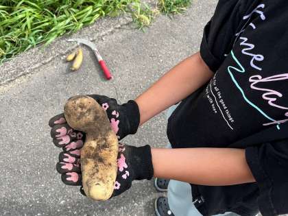 今朝畑に来た子供たちと一緒に、じゃがいもの出来を見てみました。いくつか掘り返してみると、しっかりできているようで、子供たちはとても盛り上がっていました。明日は、畑の半分くらいを収穫しようと思っています。
