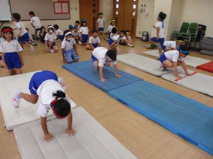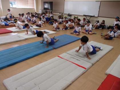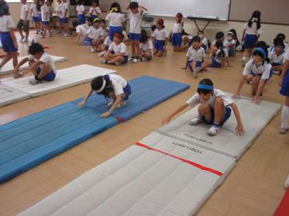 今日から体育でマット運動が始まりました。かえるとびやあざらし歩き、前転、後転などをしました。中にはすでに倒立前転ができる子供もいました。