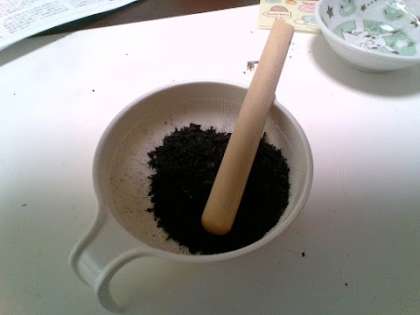 これは昨日の午前1時から午後2時まで、お日様に当たる場所で干したしそを、家にあったごますりですったゆかりふりかけです。