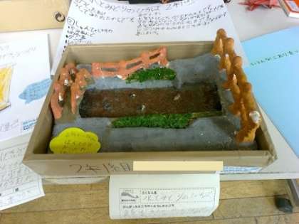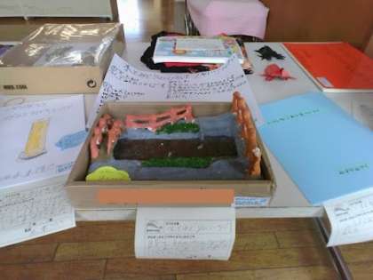 2年生の子が作った自由研究です。川の部分が透明になっていて、とてもリアルに水と緑の広場が作れているなと思いました。