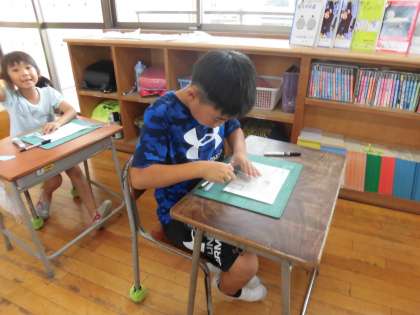2年生の図画工作科の学習では、「まどからこんにちは」に作品作りに取り組んでいます。画用紙にカッターを使って窓を開け、中から思い思いの人やものを登場させます。