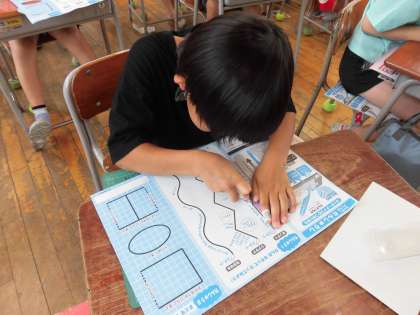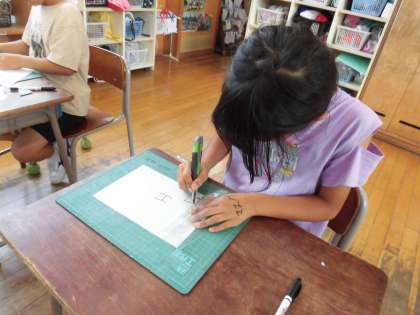 これまでほとんどカッターを使ったことがない子どもたちが多いので、最初にカッターの使い方を練習しました。カッターをスッと手前に引くことが難しい様子でしたが、「上手く切れたよ」と嬉しそうに話す姿が見られました。