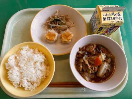本日の給食は、ごはん、にんじんシューマイ、塩ナムル、回鍋肉、牛乳です。