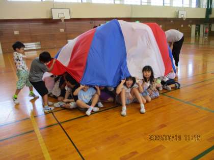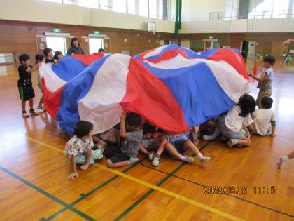 パラシュートでは、みんな大盛り上がり!暑さも関係なく、中に入ったり布をもって揺らしてみたり、みんなで楽しんでいました。