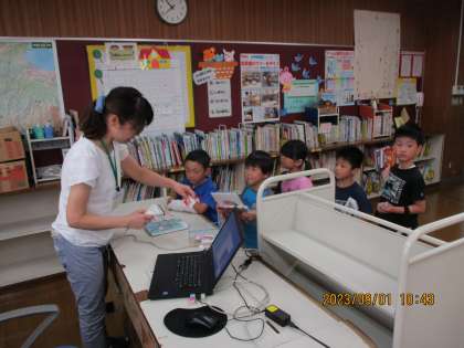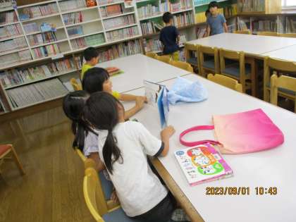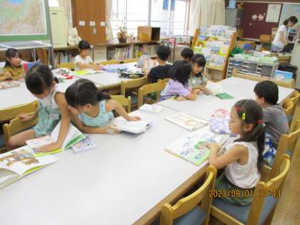 本の貸し出しが始まり、どの本を借りようか、ワクワクしている1組の子供たち、面白そうな本をいろいろ手にとって読み始めていました。いよいよ読書の秋、じっくりしっとり本を読み深めたくなる時期、ぜひお家でも親子で読書を楽しんでください。