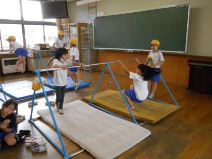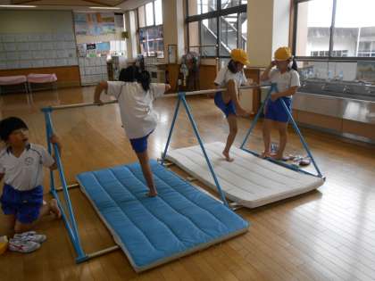 支え技やぶら下がり技、回り技など、友達と教え合いながら、楽しく練習しています。