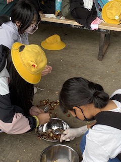 6年 宿泊学習 草木染め 公開日 2023/09/21 更新日 2023/09/21 6年生 立山青少年自然の家の付近にあるもの、家から持ってきたもので染め物体験をします。 よもぎ、ブルーベリー、玉ねぎの皮、栗の皮から色を出します。 どんな色になるか楽しみです。