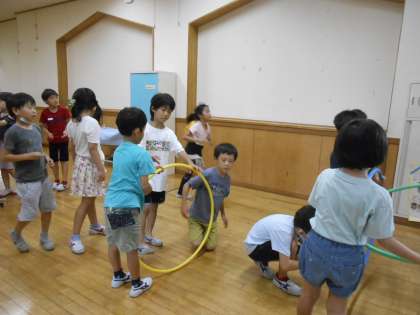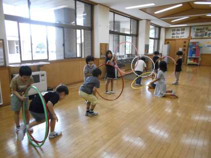 今日は、友達と一緒に、フラフープを好きな高さに持って、くぐりました。フープの高さを工夫したり、いろいろな向きのフープをくぐり抜けたりすることを楽しんでいました。