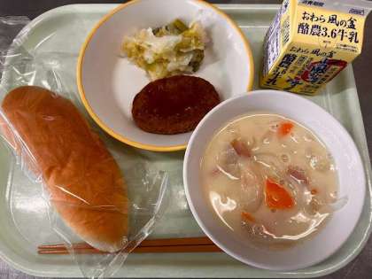 本日の給食は、コッペパン、ハンバーグのケチャップ煮、アスパラサラダ、ホワイトシチュー、牛乳 です。