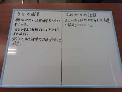 ぼくは、宿泊学習で、ポイント探しをしたときに成長できたと思います。これからの課題は、諦めないことで毎日の生活でよりよくなっていけるように気を付けていきたいです。これからも、勉強もスポーツも諦めたくないです。6−3 M.E