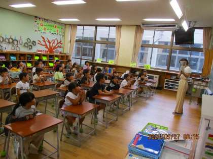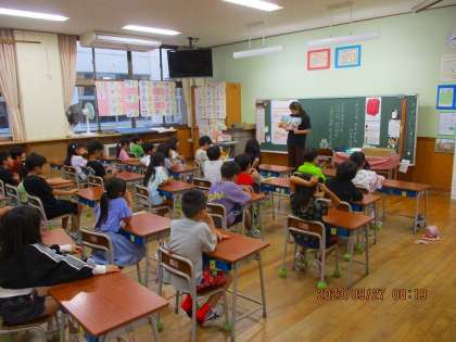 2学期になり、久しぶりの読み聞かせでした。1組では、トイレに行きたい男の子が「もっちゃう」と慌てながらトイレを目指すのに、自分の求めるトイレになかなかたどり着けず、最後はどうなるの?というドキドキ、ハラハラする面白いお話でした。