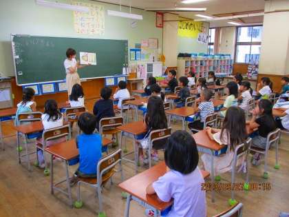 2学期になり、久しぶりの読み聞かせでした。1組では、トイレに行きたい男の子が「もっちゃう」と慌てながらトイレを目指すのに、自分の求めるトイレになかなかたどり着けず、最後はどうなるの?というドキドキ、ハラハラする面白いお話でした。