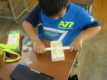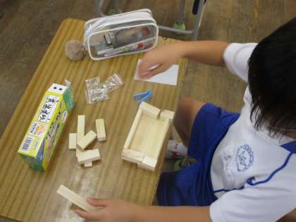 図工の時間の様子です。図工では、「くぎうちトントン」という、木材に釘を打ち工夫してつなげる学習をしています。今日は実際に釘を打つことはせず、どんな形にしようかと見立てる活動を行いました。動物の形を作っている子、家を作っている子など様々な形がありました。最終的にどうなるか楽しみですね。