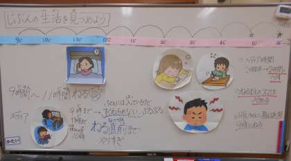 学校保健委員会の発表の後、自分たちの寝る時間について確認しました。また、「スマホをたくさん見ていたら、布団に入ってもすぐ眠れないよ。」「寝る直前までやっていたらだめだよ。」など、睡眠とメディアの関係についても考えました。