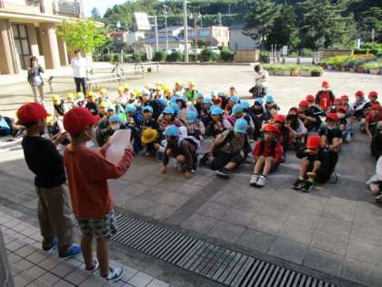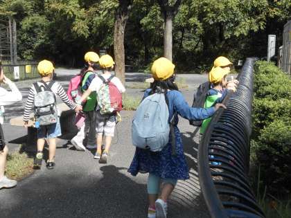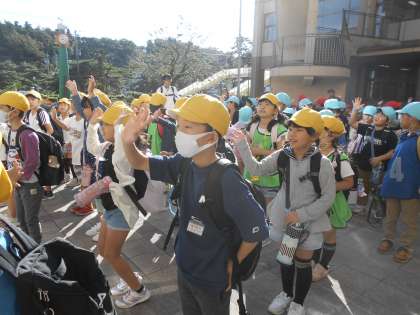 学校で出発式を行い、晴天の下、バスに乗って出かけました。