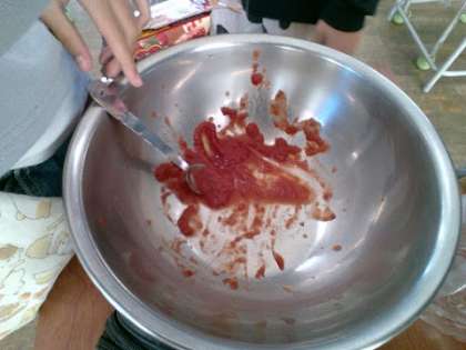 友だちが持ってくれてきたケッチャップと自分たちが作ったものを比べました。