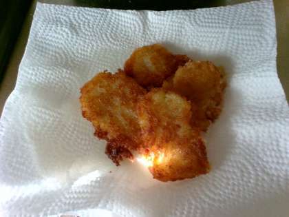 ハッシュドポテトを作ってみました。 材料は、じゃがいも1こ(茹でたもの)片栗粉5g、コンソメ少々、バター5g、塩コショウ少々です。じゃがいもをすりつぶし混ぜて形を整えました。