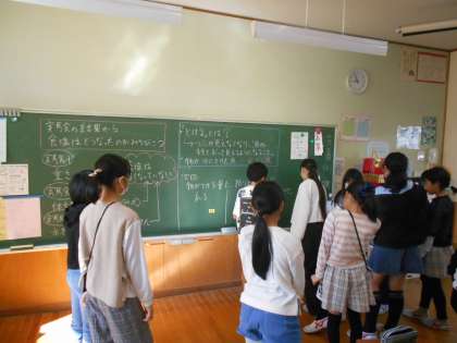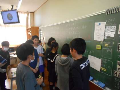 各学級、予想を黒板にネームプレートで意思表示しながら、