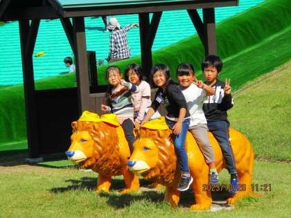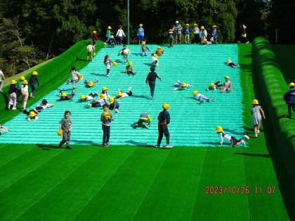 子供たちの活動場所はいくつもありましたが、一番人気は滑り台でした。圧倒的な人気で、みんなが夢中になって滑っていました。中には、ドングリを袋にいっぱい集めている子もいて、午前中の活動はあっという間に過ぎました。