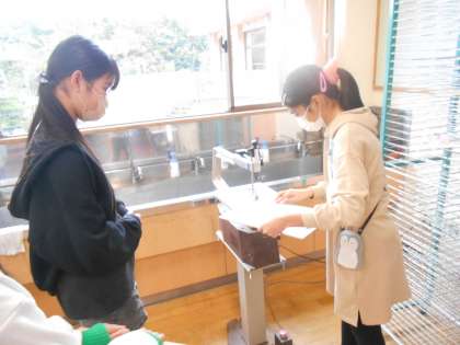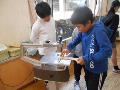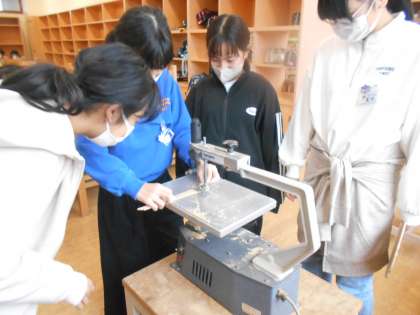 5年生で初めて「糸のこぎり」を用いて、板を線上に切って形を作っています。