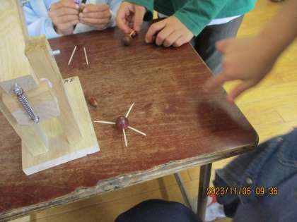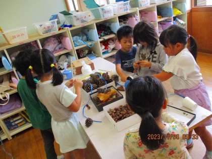生活科の時間や校外学習で集めた秋を使って、おもちゃをつくっています。