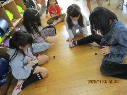 どんぐりごまや剣玉、やじろべえなど自分たちで作り方を調べたり友達に聞いたりしながらつくっています。