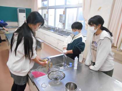 登校した子供から家庭科室に集まり、