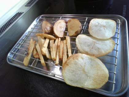 これは、家で揚げたポテト、ポテチ、厚切りポテトです。油の温度は160度、揚げた時間は、ポテトが5分、ポテチが3分、厚切りポテトが5分です。味つけは塩で一つまみです。ポテトの揚げはじめは、泡がすごくてどうなってるか分からなかったです。ときどき様子を見ていたら、きれいな色になりました。厚切りポテトが一番むずかしかったです。なぜなら、見た目がよくても、中まで火が通っていないとだめだったからです。結果は成功でした。
