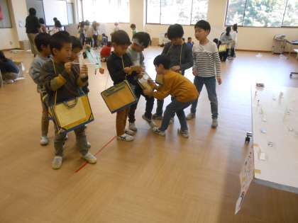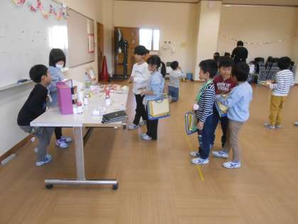 おもちゃは、わりばしで作ったゴムでっぽう、紙コップや牛乳パックを利用したぴょんぴょんガエルやぴょんコップ、ストローアーチェリー、車、新聞紙やトイレットペーパーを利用したロケット、キャップ飛ばしなど子供たちのアイデアがいっぱいです。