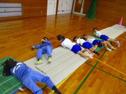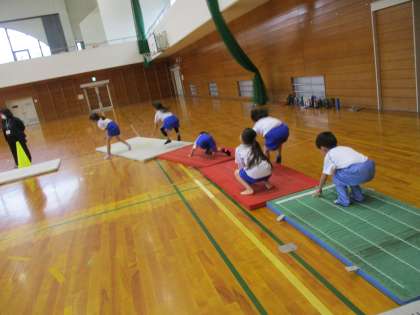 今日は、体育館にあった全てのマットを使ってマット遊びをしました。このマットを全部使って大きな丸を作ろう!と投げかけると、みんなで協力し合ってあっという間に体育館に大きなマットの輪ができました。そのマットの上をいろいろな動物やものになりきってぐるぐるぐるぐる回る。みんな楽しそうに体を動かしていました。
