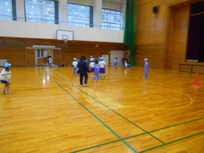 体育でキックベースボールをしています。「どのようにしたら、たくさん点をとることができるか」「相手に点数を入れられないようにするには、どのようにするか」を作戦会議の中で話し合いました。チームの仲間と声をかけながら一生懸命プレーしています。