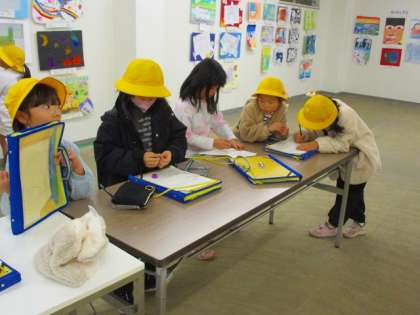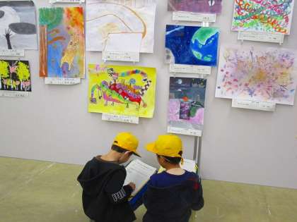 読めない漢字があったら聞きに来る子供たち。「何の絵だろう」「どうやって描いたのだろう」と絵の世界に引き込まれていました。また、友達の絵を見付けて「すごいね」「上手だね」と声をかけている子もいました。