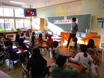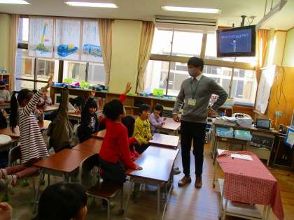 外国語の先生との授業がありました。初めての外国語の授業は、みんなドキドキしていましたが、色の名前や先生の好きな食べ物、スポーツを当てるクイズなど、みんな何度も手を挙げて答えていました。
