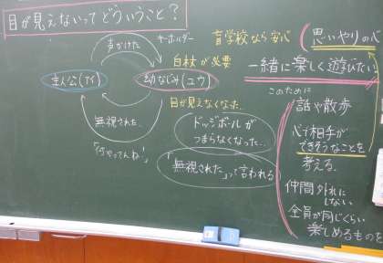 1組は、目の見えなくなった子とその友達の姿を描いた資料から、障害の有無に関わらず楽しく過ごす方法を考えました。
