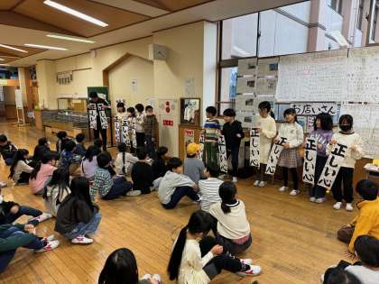 1月12日(木)書き初め大会結果発表 公開日 2024/01/11 更新日 2024/01/11 3年生 書初大会では、冬休みの間に一生懸命に取り組んだ練習の成果を発揮することができました。 3年生ではスタートタイムに書き初め大会の金賞受賞者12名を紹介しました。