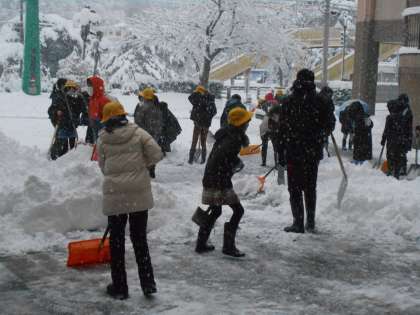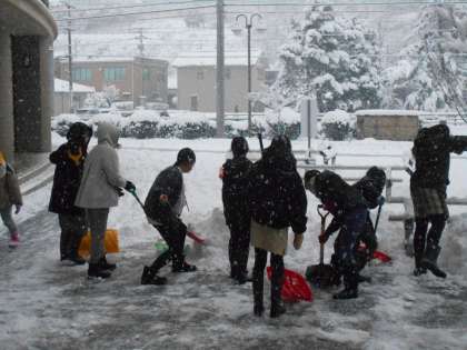 5・6年生で除雪したり、下学年に雪をはらって玄関に入るよう声をかけたりしてました。