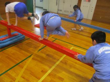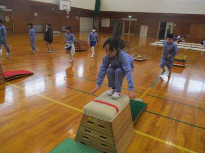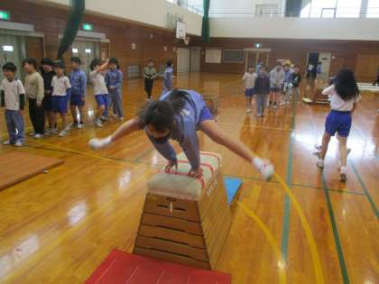 実際に跳び箱を跳び、台上前転に挑戦している子供もいました。この学習が終わるまでに全員が台上前転をできることを目指しています。